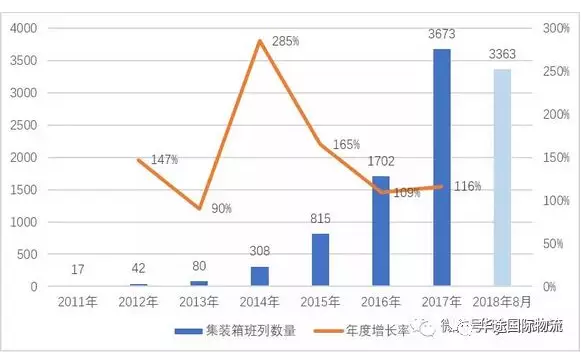 中欧班列无疑是中国提出“一带一路”倡议后,国人践行这一倡议最有力的诠释。至今,没有那个物流市场可以出现这种几何级数的增长,从2011年重庆惠普班列开行为标志,8年时间,每年增长率都超过了100%,最跳跃的是2014年,增长率高达285%。从以下数据看,中欧班列开始形成燎原之势的应该是2014年,进入快速增长期的应该是2016年。说中欧班列是新市场、新事物,是探索期,要容许试错,一点不为过。